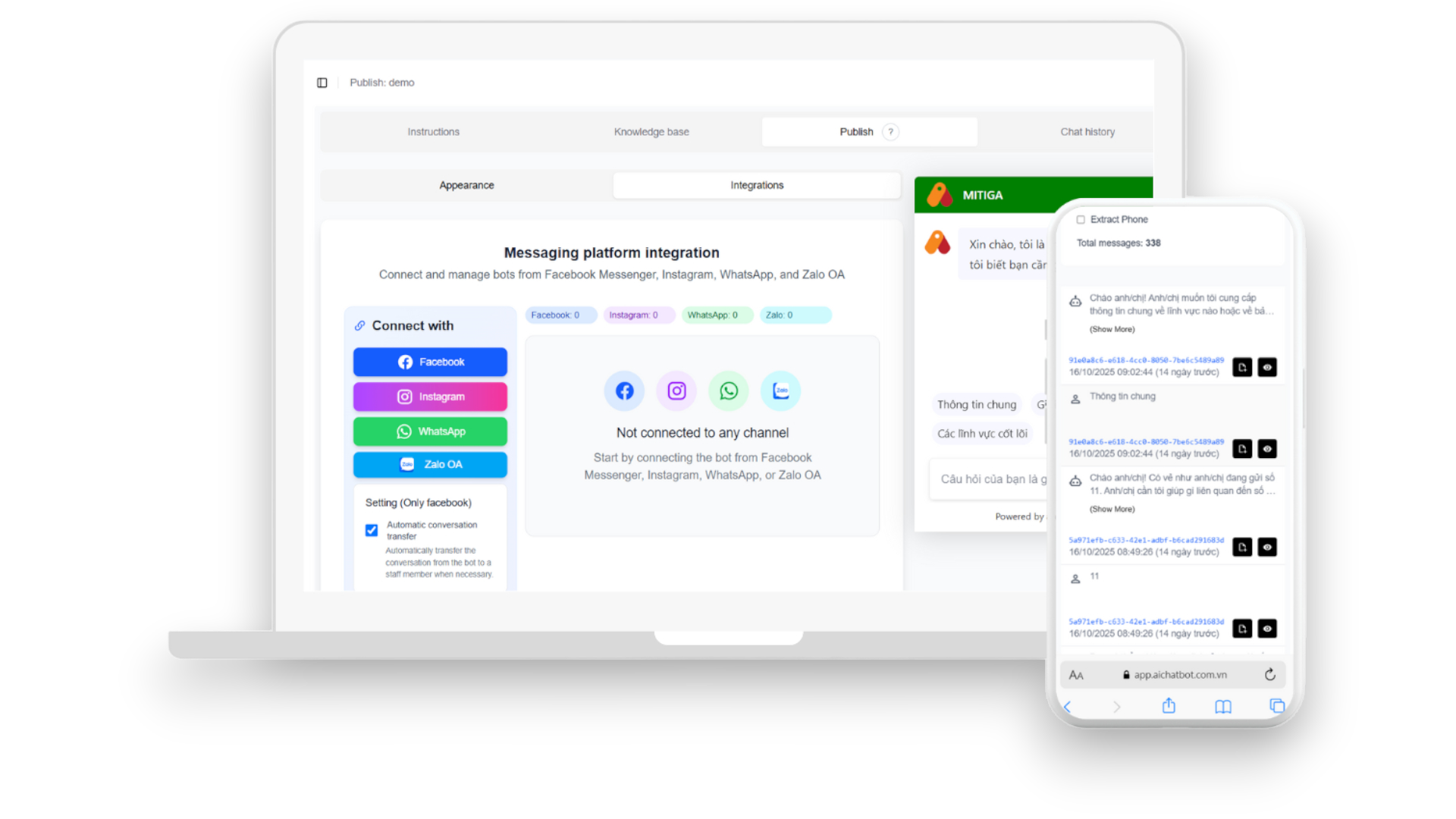 - Kết nối đa kênh: Facebook, Zalo, Instagram, WhatsApp, Website